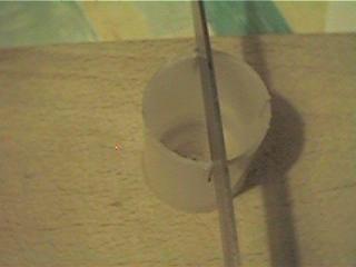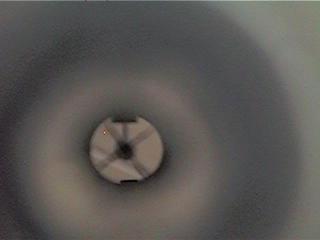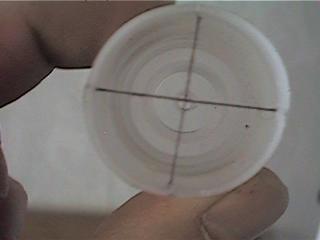 Wenn die Filmdose im Okularauszug wackelt, umwickeln wir diese mit etwas Tesafilm. Wenn wir nun die Filmdose in den Auszug stecken und durchsehen, sieht das ganze etwa so aus. Das kommt leider mit der Kamara nicht so gut, man kann es aber noch erkennen. Fadenkreuz auf der Mitte des Fangspiegels(Markierung), und auf der Mitte des Hauptspiegels(Markierung). Nun können wir wenn das so stimmt, mit dem Laser die Neigung des Hauptspiegel einstellen. Um jeweils den wichtigen Punkt scharf zu gekommen, müßen wir mit dem Auge jeweils den Punkt fokusieren , den wir brauchen. Mit ein bisschen Übung geht das sehr gut. Wichtig: Die Fildose nicht mit den Schrauben festklemmen, da dieses die Dose verformt !Auf einem Frame gelandet ? Hier geht zur Hauptseite